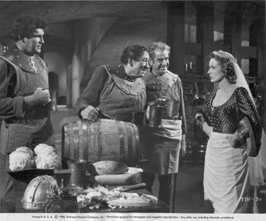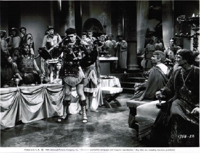 Sim Iness, American Olympic Games discus star, turns movie actor to portray a professional strong man of 5th century Constantinople in the banquet scene from Universal-International's spectacular drama of 5th century Europe, "Sign of the Pagan," filmed in Technicolor by CinemaScope cameras with Jeff Chandler, Jack Palance, Ludmilla Tcherina and Rita Gam in starring roles. |